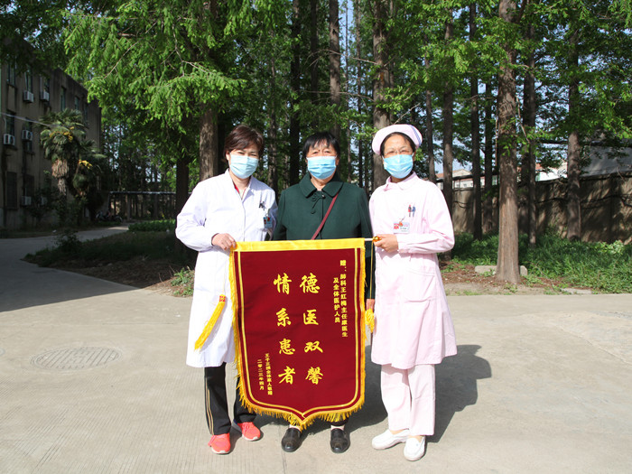 原來,這位大媽的老伴兒叫王子正,今年72歲了,是一位患有矽肺、肺心病、冠心病、腦梗塞、帕金森病等基礎(chǔ)疾病的患者,今年1月時,由于感染了新冠肺炎,王子正老人病情危重,經(jīng)過職業(yè)病科主任王紅梅及全科醫(yī)務(wù)人員的全力搶救,和三個多月的精心治療護理,現(xiàn)在身體基本康復(fù)。老人的兒子帶著父母來到醫(yī)院,向醫(yī)護人員表示誠摯感謝,王子正老人的老伴兒將錦旗親手送到了院行風(fēng)辦。
