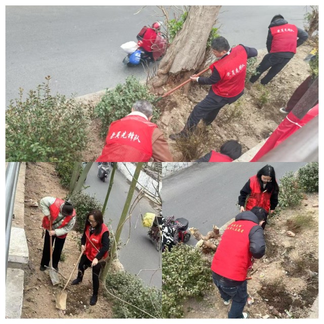 活動(dòng)現(xiàn)場(chǎng),黨員們充分發(fā)揮模范帶頭作用,他們身穿“黨員先鋒隊(duì)”紅馬甲、佩戴黨員徽章,精神飽滿、熱情高漲地投身在綠化活動(dòng)中,大家二人成組、三人成團(tuán),有的扶苗栽種,有的揮鍬填土,有的抬水澆灌,各個(gè)環(huán)節(jié)一絲不茍、井然有序。在黨員先鋒隊(duì)成員們的辛勤勞動(dòng)和默契配合下,南天竹、迎春花等綠植苗紛紛被種下,為社區(qū)綠化帶增添了新景觀。