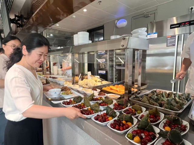次日中午,集團工會在員工餐廳精心準(zhǔn)備了色彩繽紛的水果拼盤、香甜軟糯的蜜棗粽子,為集團員工送上節(jié)日祝福。大家圍坐在一起,一邊分享昨日包粽的趣事,一邊品嘗蜜粽鮮果,食堂里洋溢著歡聲笑語。