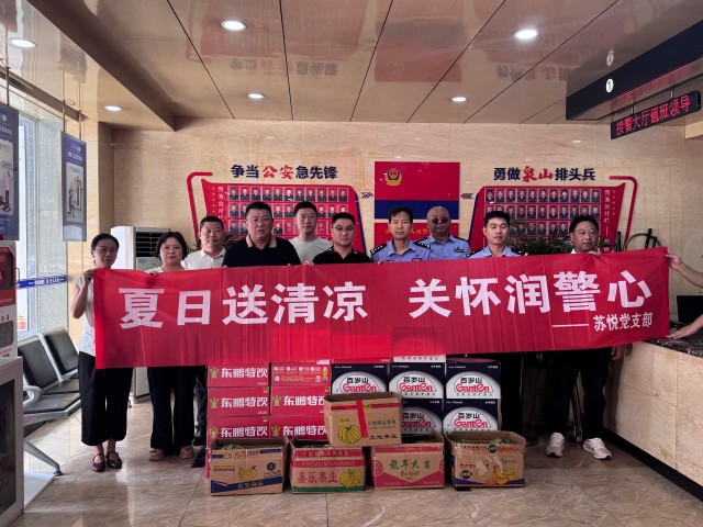 為表達對高溫酷暑中堅守崗位的公安民警的敬意與關(guān)懷,深化警企共建情誼,近日,蘇悅黨支部組織黨員代表,前往徐州市公安局泉山分局王陵派出所,開展“夏日送清涼”慰問活動,為奮戰(zhàn)在維護治安、服務(wù)群眾第一線的民警送去夏日清涼物資。