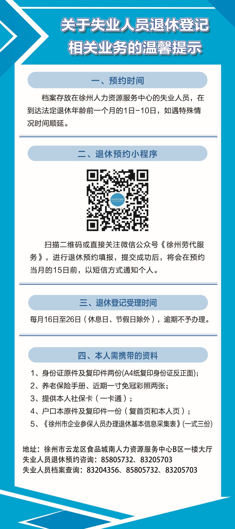 自3月1日起,凡符合以下兩個條件的退休人員,只需在到達法定退休年齡前一個月的10日內(nèi),關(guān)注微信公眾號“勞代服務(wù)”,即可辦理預(yù)約登記:(1)檔案存放在徐州市人力資源服務(wù)中心的失業(yè)人員;(2)未參加過工作,異地戶口以個體繳納徐州市本市養(yǎng)老保險的純個體人員。