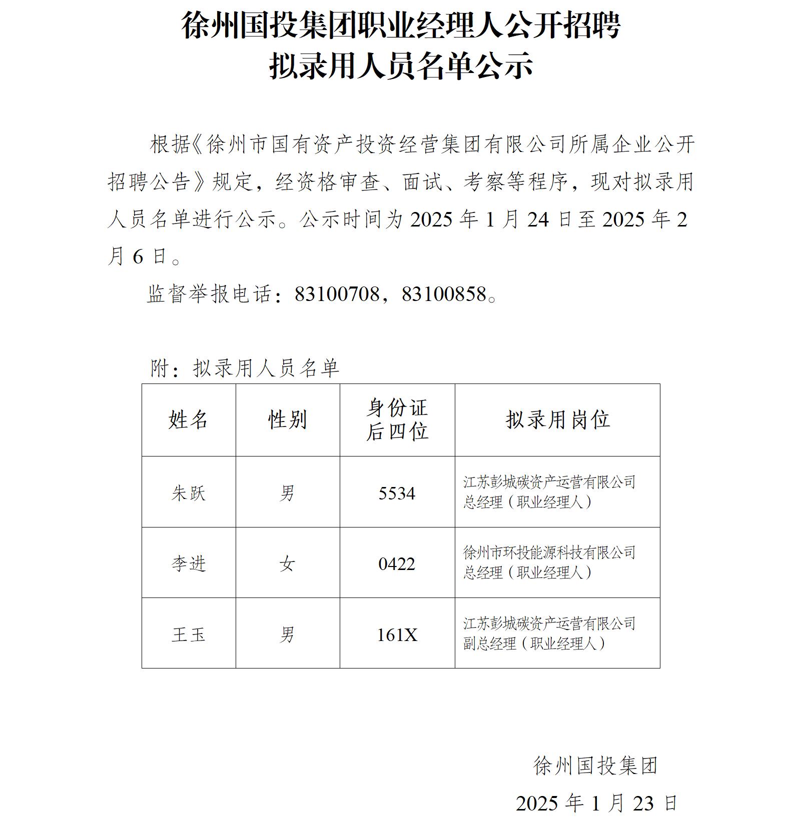 徐州國(guó)投集團(tuán)職業(yè)經(jīng)理人公開招聘擬錄用人員名單公示