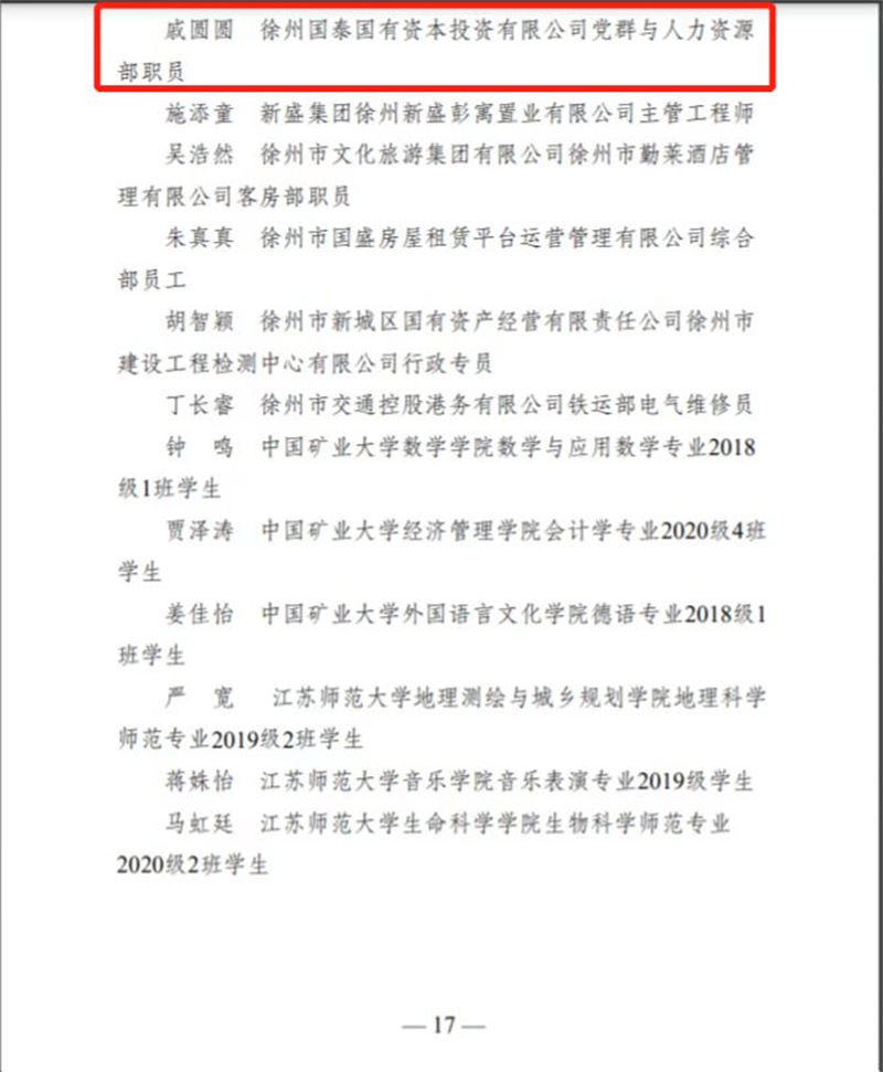 戚圓圓,女,漢族,1997年12月出生,大學(xué)學(xué)歷,現(xiàn)為徐州國(guó)泰國(guó)有資本投資有限公司黨群與人力資源部職員。入職以來主要負(fù)責(zé)國(guó)泰投資團(tuán)總支團(tuán)員青年工作。