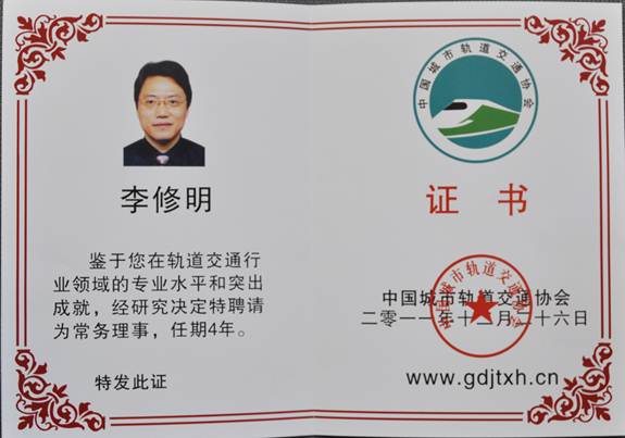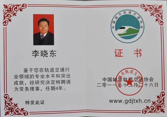 2011年12月26日,集團(tuán)公司正式獲批成為中國城市軌道交通協(xié)會常務(wù)理事單位,2012年1月4日集團(tuán)公司作為中國城市軌道交通協(xié)會常務(wù)理事單位正式掛牌開展工作。集團(tuán)公司黨委書記、董事長李修明,黨委副書記、副董事長、總經(jīng)理李曉東被中國城市軌道交通協(xié)會特聘為常務(wù)理事。