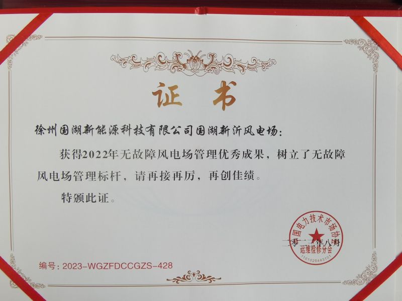 8月24日,徐州國(guó)湖新能源科技有限公司所屬國(guó)湖新沂風(fēng)電場(chǎng)榮獲中國(guó)電力技術(shù)市場(chǎng)協(xié)會(huì)頒發(fā)的“2022年無(wú)故障風(fēng)電場(chǎng)管理優(yōu)秀成果”獎(jiǎng)項(xiàng)。