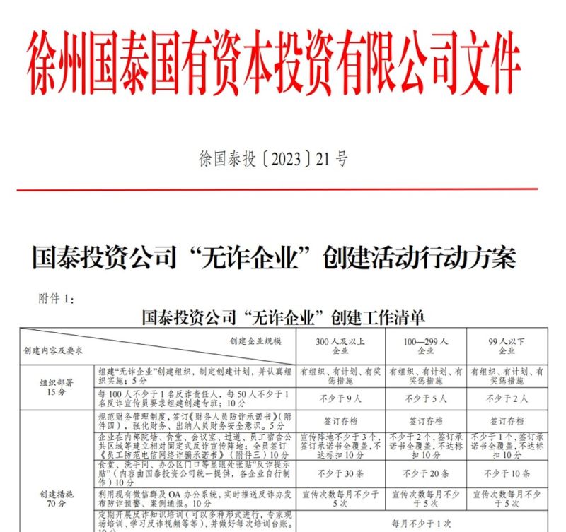 為順利推進(jìn)“無詐企業(yè)”創(chuàng)建工作,國泰投資公司成立“無詐企業(yè)”創(chuàng)建工作領(lǐng)導(dǎo)小組,制定《“無詐企業(yè)”創(chuàng)建工作清單》,強(qiáng)調(diào)要加強(qiáng)防范電信網(wǎng)絡(luò)詐騙學(xué)習(xí)、加強(qiáng)內(nèi)外部反詐宣傳以及運用科學(xué)技術(shù)加強(qiáng)保障等方面的工作,樹立保護(hù)職工“錢袋子”就是促進(jìn)企業(yè)安全生產(chǎn)、健康發(fā)展理念,共同努力打造“無詐企業(yè)”良好形象。