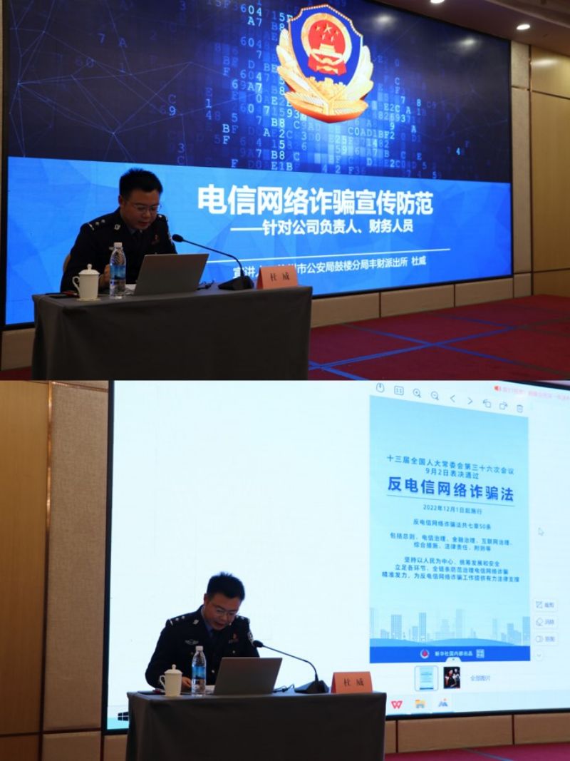 國泰投資公司以“無詐企業(yè)”創(chuàng)建活動為牽引,邀請徐州市公安局鼓樓分局豐財派出所杜所長擔(dān)任主講人,開展了一期“電信網(wǎng)絡(luò)詐騙防范宣傳”專題培訓(xùn)。杜所長以近期頻發(fā)的電信網(wǎng)絡(luò)詐騙真實案件為例,為員工深入剖析電信詐騙的基本類型、話術(shù)特點、基本流程以及防范措施,用“以案釋法”的方式講解了冒充客服詐騙、AI科技詐騙、刷單詐騙、公檢法詐騙等常見手段,從不同角度為員工講授防騙知識,同時也向員工普及了《網(wǎng)絡(luò)安全法》《反電信詐騙法》《個人信息保護(hù)法》等相關(guān)的法律法規(guī)知識。