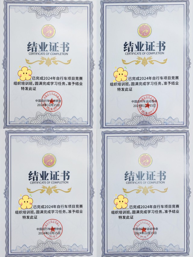 12月中旬,國(guó)體文化體育(徐州)有限公司(以下簡(jiǎn)稱“國(guó)體徐州”)經(jīng)過(guò)了嚴(yán)格的篩選與審核,選拔了4名競(jìng)賽組織管理人員參加了中國(guó)自行車(chē)運(yùn)動(dòng)協(xié)會(huì)組織的“2024年自行車(chē)項(xiàng)目競(jìng)賽組織培訓(xùn)”,并通過(guò)考核取得結(jié)業(yè)證書(shū)。