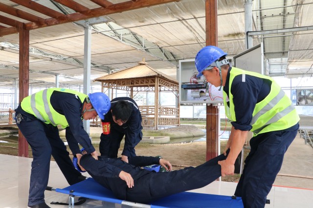 14時(shí)35分,刺耳的警報(bào)劃破寧?kù)o,觸電搶救應(yīng)急演練率先登場(chǎng)。四名電站運(yùn)維員工組成的應(yīng)急小組迅疾響應(yīng),嚴(yán)格按照預(yù)案流程行動(dòng)。只見(jiàn)一人果斷切斷電源,另一人利用絕緣桿將“觸電者”安全脫離危險(xiǎn)區(qū),其余隊(duì)員立即上前進(jìn)行規(guī)范的心肺復(fù)蘇急救。整個(gè)過(guò)程緊張有序,展現(xiàn)了團(tuán)隊(duì)在突發(fā)險(xiǎn)情中的高效協(xié)作與過(guò)硬技能。演練結(jié)束,安全專(zhuān)家即時(shí)點(diǎn)評(píng),對(duì)脫離電源的技術(shù)要點(diǎn)與心肺復(fù)蘇操作標(biāo)準(zhǔn)進(jìn)行強(qiáng)化講解,切實(shí)提升現(xiàn)場(chǎng)人員的應(yīng)急實(shí)戰(zhàn)能力。