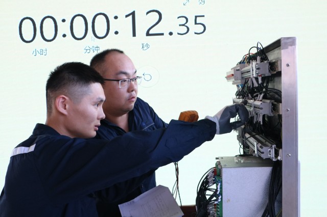 練兵場(chǎng)亦是競(jìng)技臺(tái)。15時(shí)30分,高壓開(kāi)關(guān)柜回路故障消缺實(shí)操比賽開(kāi)始。多支參賽隊(duì)伍輪番上陣,在裁判嚴(yán)格監(jiān)督下展開(kāi)較量。面對(duì)預(yù)設(shè)的復(fù)雜回路故障,選手們身著統(tǒng)一工裝,佩戴齊整防護(hù),審閱圖紙、測(cè)試分析、精準(zhǔn)排障。每一次舉手示意操作、每一次工具精準(zhǔn)落點(diǎn),都體現(xiàn)著“安全第一、規(guī)范先行”的鐵律。賽場(chǎng)氣氛緊張激烈,選手們沉著冷靜的故障診斷能力與嫻熟的動(dòng)手能力贏得陣陣贊嘆。